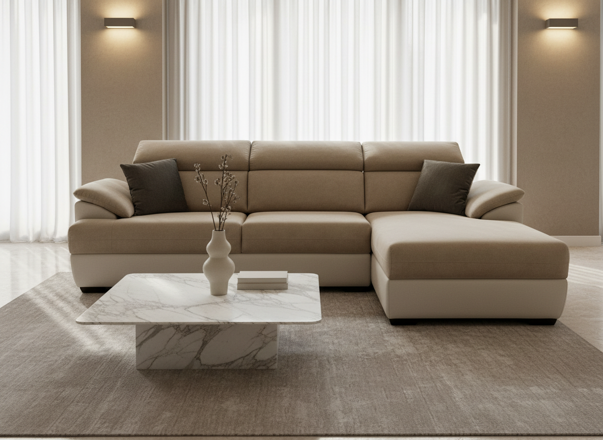 Këndi Amadeo New kombinon elegancën moderne me komoditetin dhe funksionalitetin e avancuar, duke u bërë një zgjedhje ideale për çdo ambient ndenjjeje. Me përmasa 270x180x95 cm, ai ofron hapësirë të rehatshme për relaks të përditshëm, ndërsa veshja Horton 204.01 i jep modelit një pamje të ngrohtë, elegante dhe lehtësisht të kombinueshme me interiere të ndryshme. Për më shumë rehati dhe fleksibilitet, këndi disponon mekanizma në pjesën e mbështetëses, që ju lejojnë të rregulloni pozicionin sipas dëshirës. Një model që sjell stil, rehati dhe funksionalitet në një të vetme.